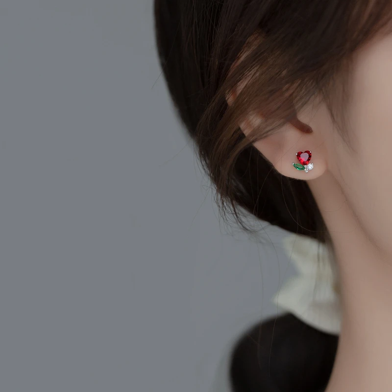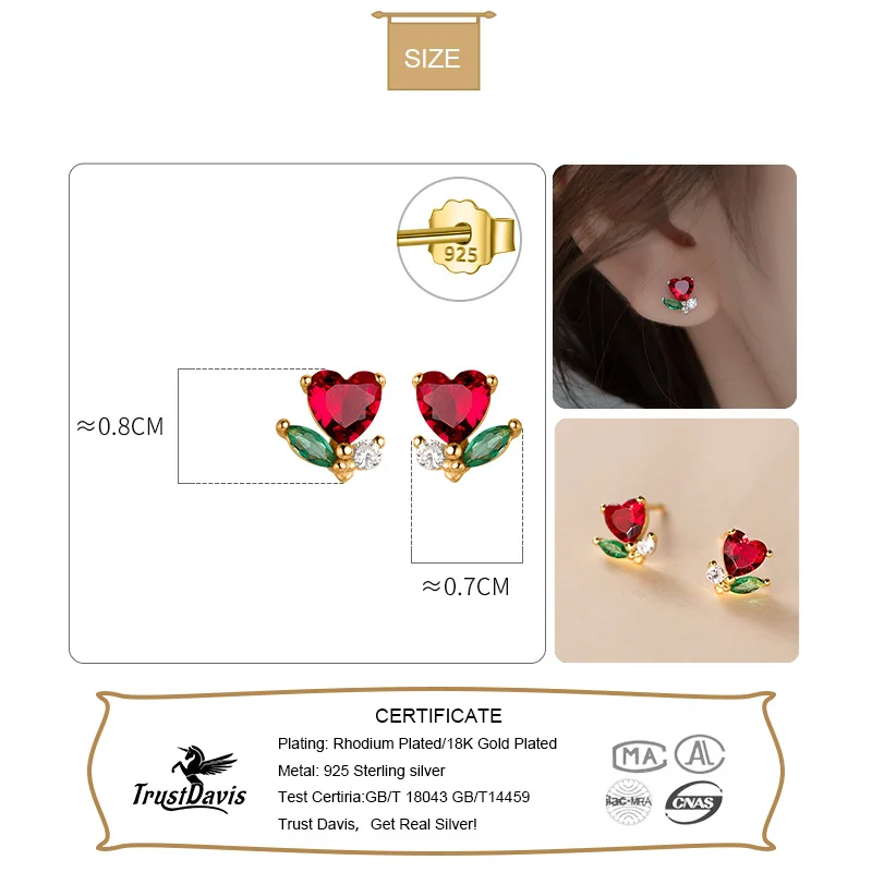 TrustDavis 925 Sterling Silver Fashion Women's Jewelry Romantic Red Heart With CZ Stud Earring Gift For Girls Kids Lady DB1236