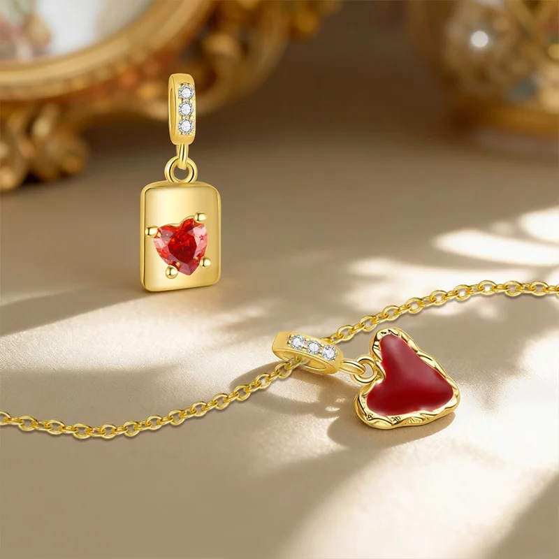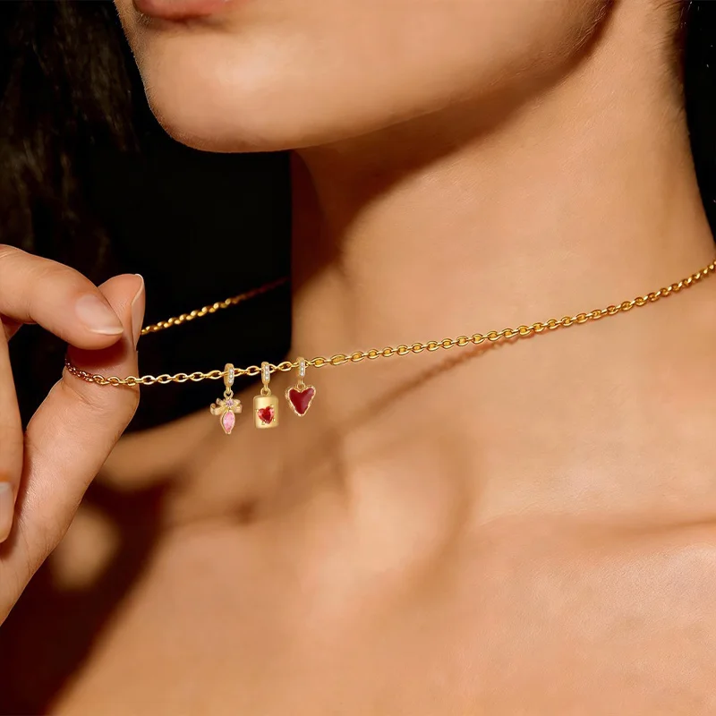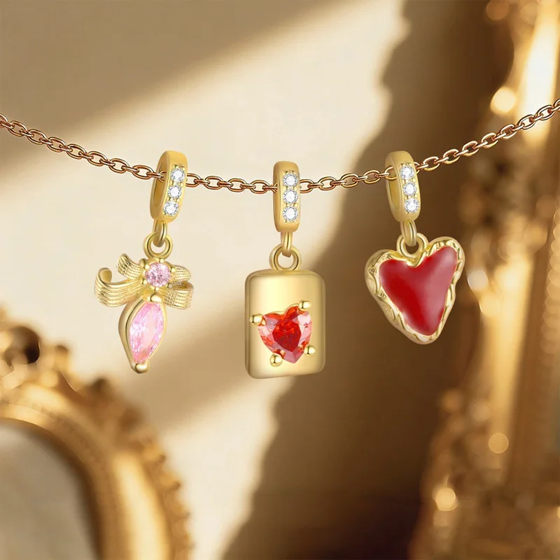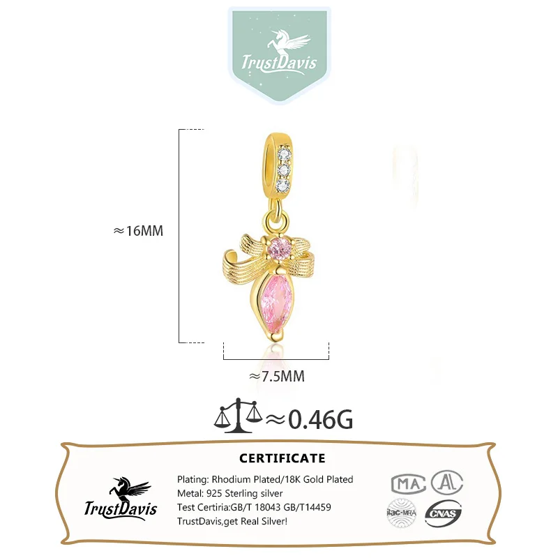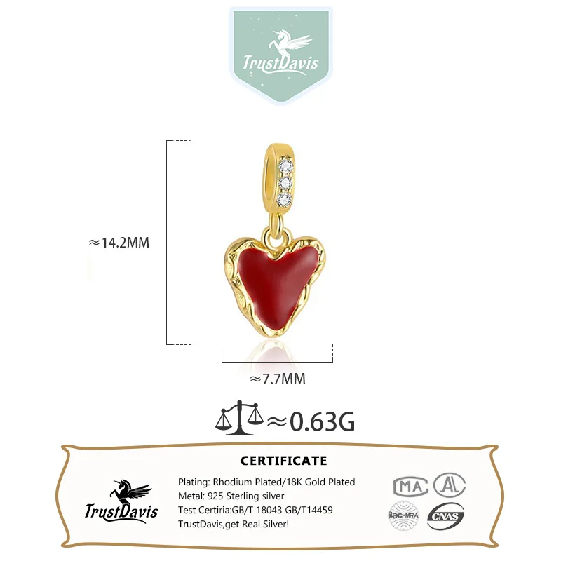 TrustDavis 925 Sterling Silver Red Enamel Heart Pink Zircon Bow Pendant DIY Necklace Bracelet Accessories Fine Jewelry DZ1846