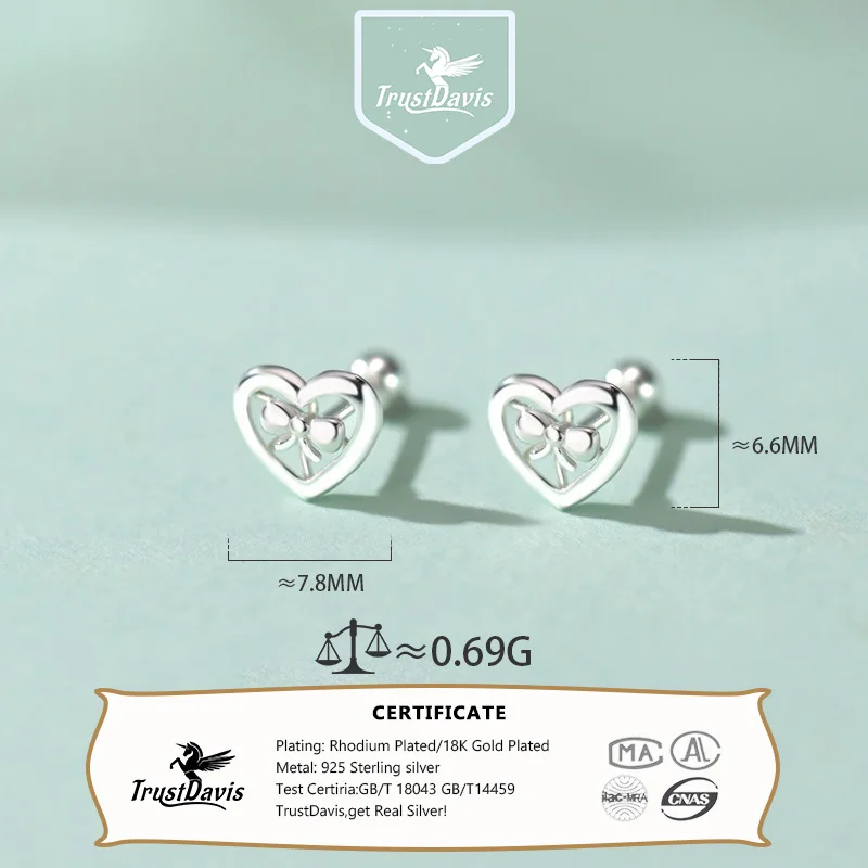TrustDavis 925 Sterling Silver Women's Fashion Simple Heart-Shaped Bow Screw Earrings for Women Girls Jewelry Gift DS4418