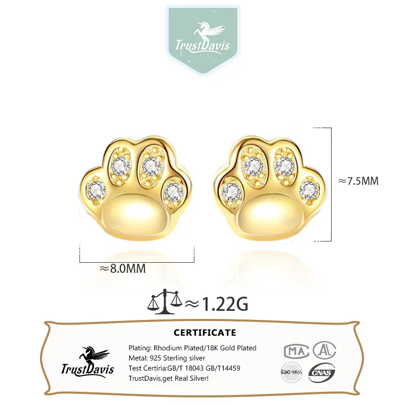 TrustDavis 925 Sterling Silver Women's Fashion Sweet Animal Cat Paw Earrings for Women Girls Jewelry Gift DS4438