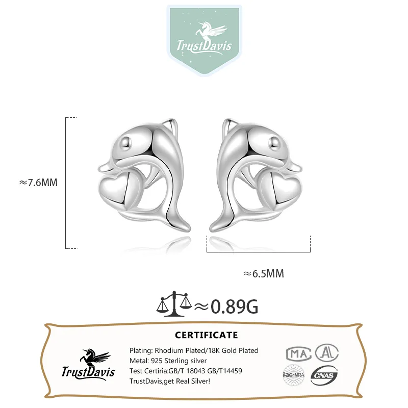 TrustDavis Real 925 Sterling Silver Cute Dolphin CZ Stud Earring for Women Daughter Birthday Gift Fine Jewelry DA3227
