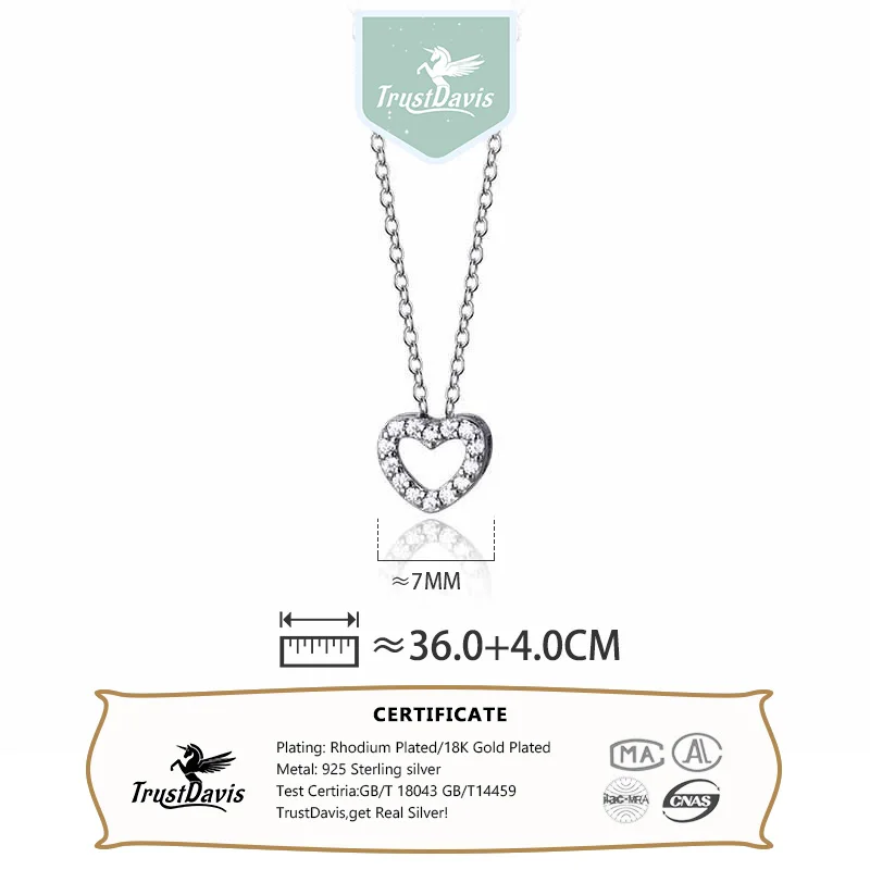 TrustDavis Real 925 Sterling Silver Fashion Simple Heart-shaped Hollow Zircon Necklacefor Women Girls Gift Fine Jewelry DS4700