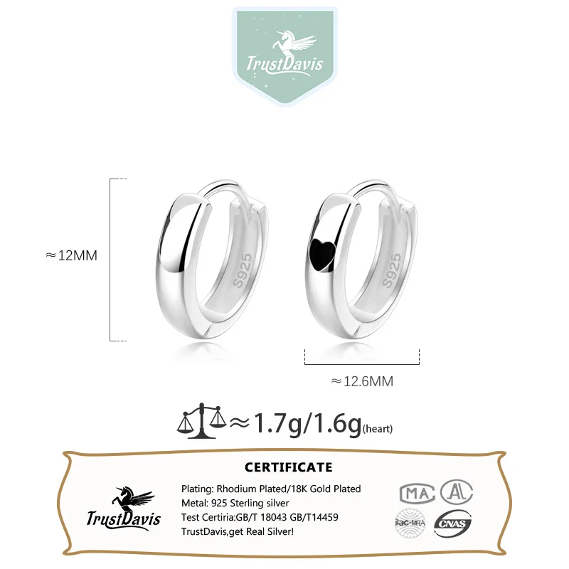 TrustDavis Real 925 Sterling Silver Fashion Sweet Heart Geometric Hoop Earrings for Women Wedding Party Fine Jewelry DS3959