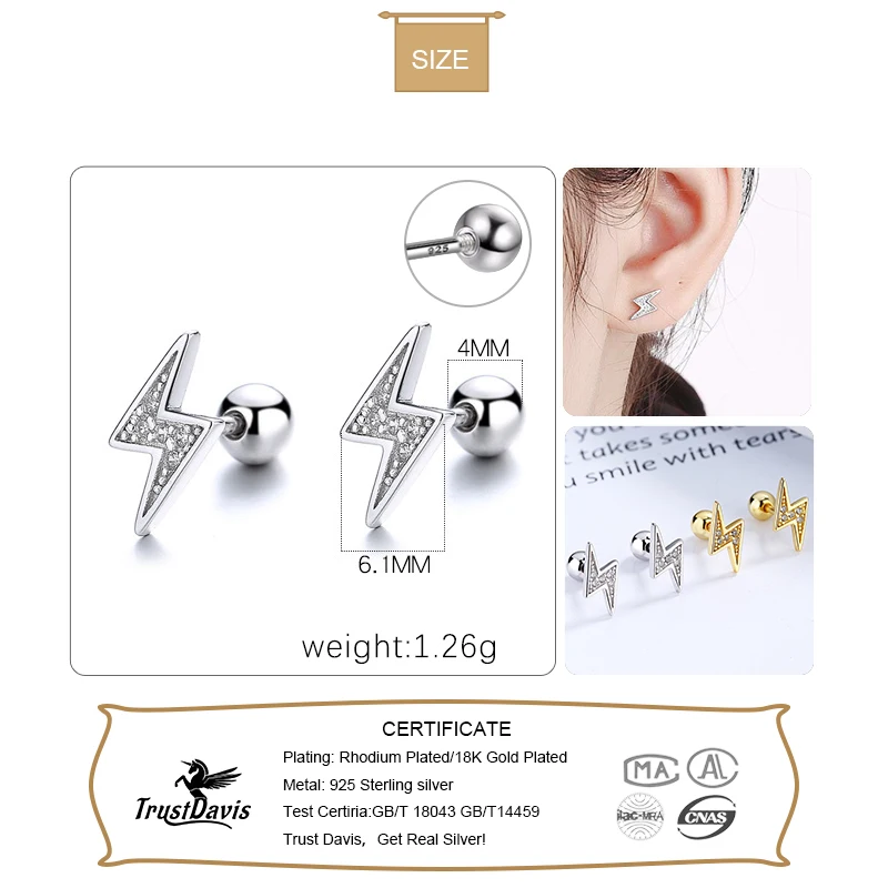 TrustDavis Real 925 Sterling Silver Fashion Sweet Lightning Shiny CZ Screw Stud Earrings For Women Wedding Fine Jewelry DA2516