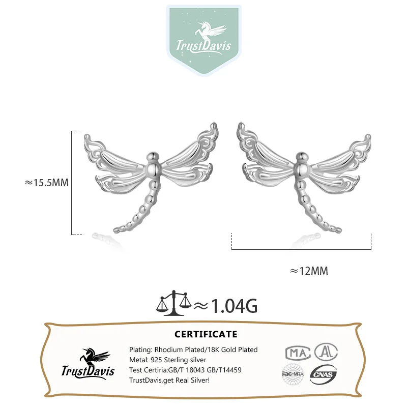TrustDavis Real 925 Sterling Silver Light Luxury Dragonfly CZ Stud Earring for Women Daughter Birthday Gift Fine Jewelry DA3228