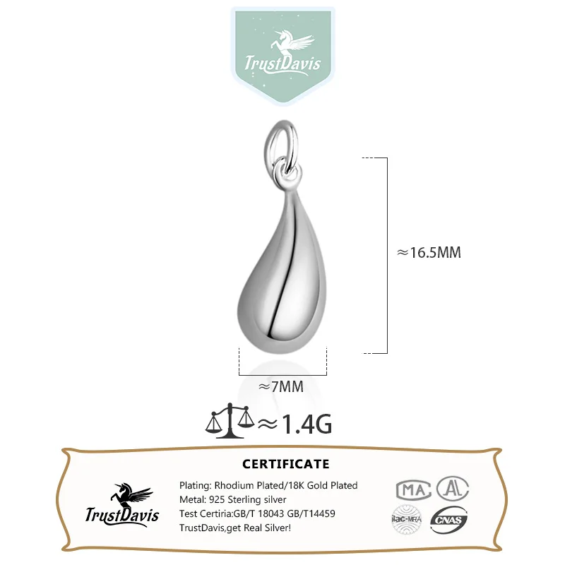 TrustDavis Real 925 Sterling Silver Necklace Bracelet Pendant Smooth Water Drop Handmade DIY Accessories Jewelry DZ891
